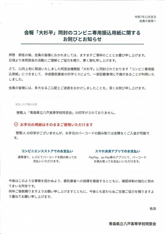 会報「大杉平」同封のコンビニ専用振込用紙に関するお詫びとお知らせ